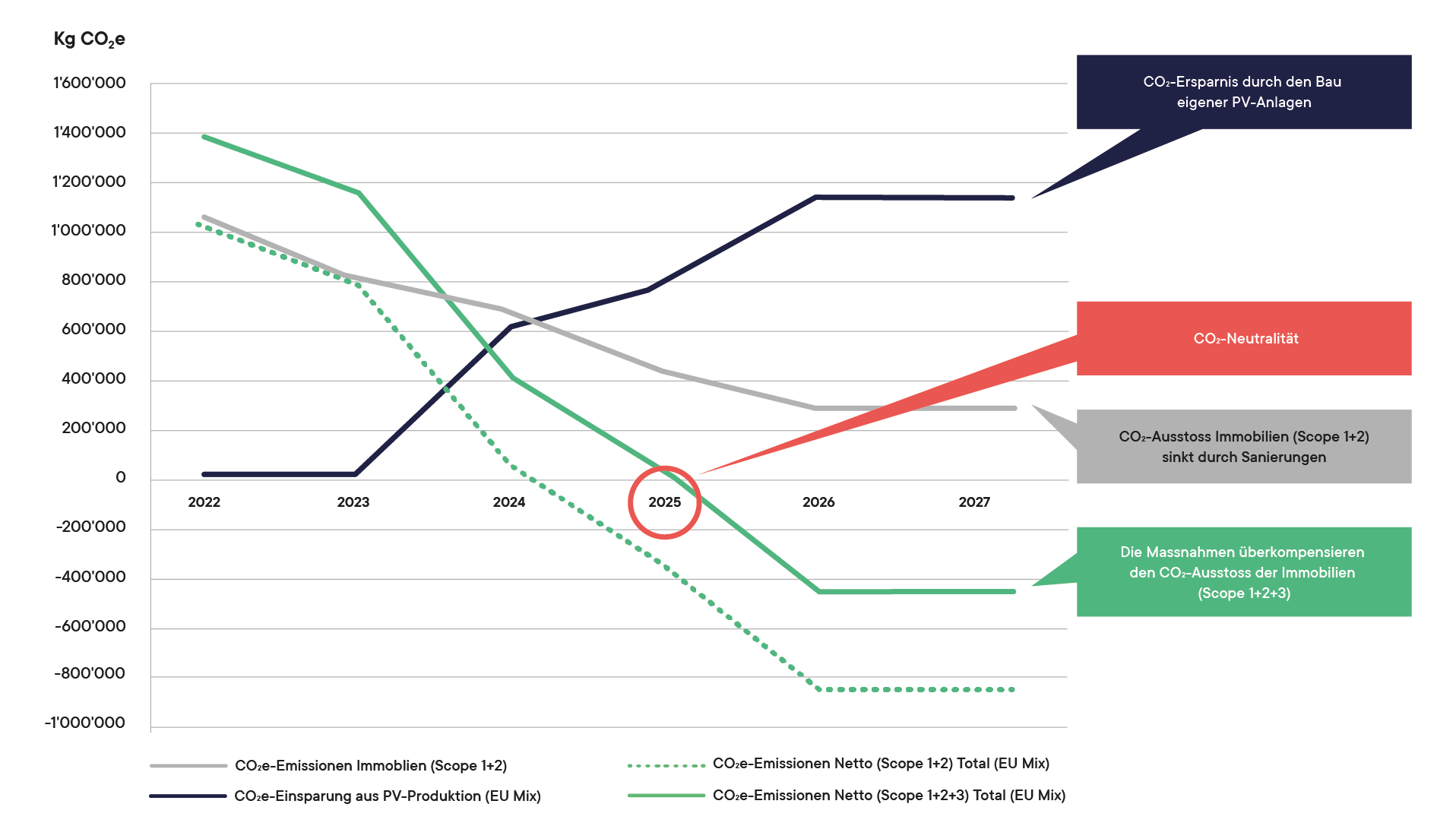 Die Kombination aus Reduktion des Verbrauchs durch energetische Sanierungen und Ausbau der Erzeugung erneuerbarer Energien senkt den CO2 Ausstoss der Liegenschaften signifikant. Die dafür notwendigen Massnahmen des Swiss Real Estate Commercial ECO Portfolios wurden evaluiert und werden Zug um Zug ausgeführt, um möglichst schnell das Ziel der CO2 Neutralität zu erreichen.